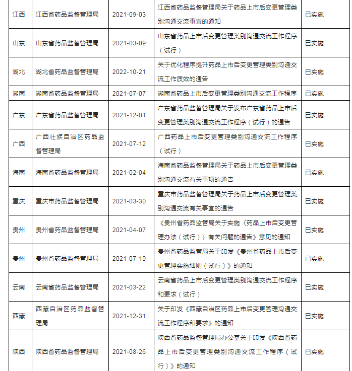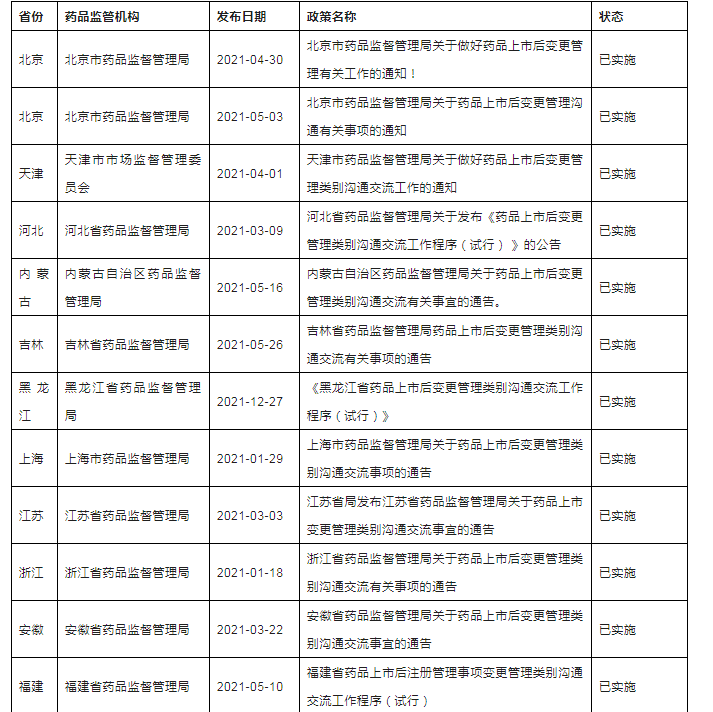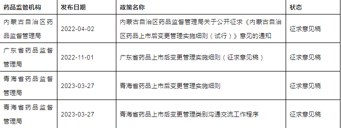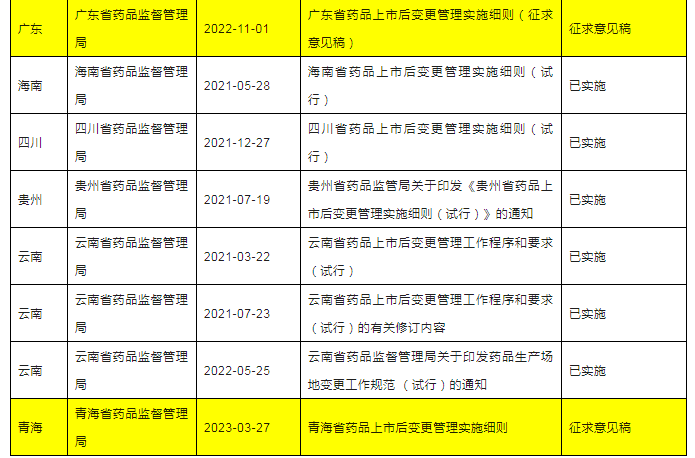 他来了!千呼万唤始出来啦!2023年3月27日,青海省药品监督管理局官网发布关于征求《青海省药品上市后变更管理实施细则(征求意见稿)》《青海省药品上市后变更管理类别沟通交流工作程序(征求意见稿)》意见的函,这是中国内地31个省市自治区第31个省局出台本省上市后变更配套的相关政策,为进一步加强药品上市后变更管理,强化药品上市许可持有人药品上市后变更管理主体责任,规范药品上市后变更行为,笔者汇总分析了截至2023年3月底的国内各省市局已发布的上市后变更配套相关政策,便于五湖四海的制药人,尤其是注册人了解和应用。
